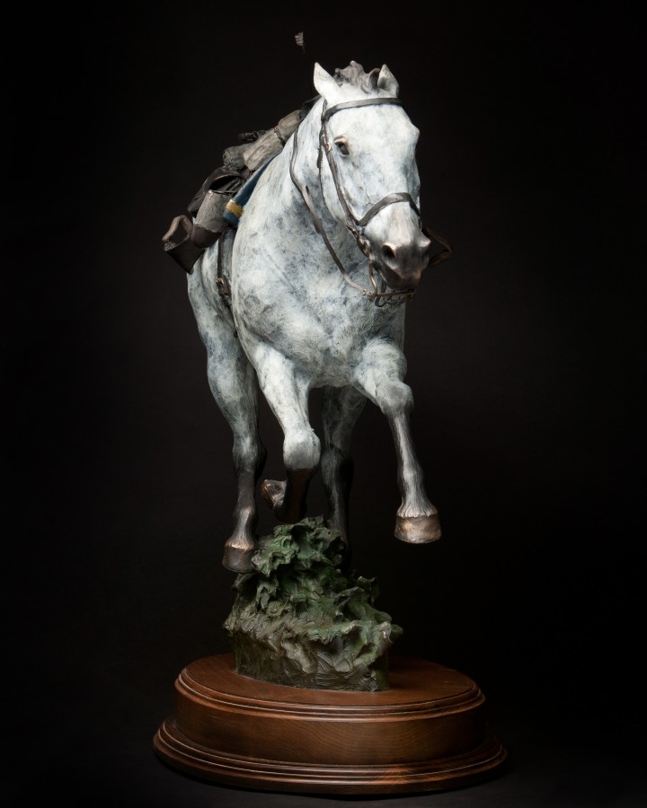 A reckless charge by the so-called Son Of The Morning Star has turned the heat of a lazy June afternoon into an explosion of Sioux, Northern Cheyenne, and Arapahoe warriors. His offensive quickly turns into a defensive as he realizes that sheer numbers and steep geography have turned against him. Mounted cavalry horses, the war machines of the age, wheel around in a mad retreat up Medicine Tail Coulee as they desperately make a run for higher ground. When they top the ridge the confused soldiers dismount and begin to form skirmish lines, some holding horses and others firing at the assault that is starting to engulf them. Crazy Horse, protected by the lightning bolts on his white face paint, races back and forth within easy range of the soldiers, blowing his eagle bone whistle as he invites bullets and death to dance with him. Rifles are quickly emptied but he remains untouched. With their bullets expended, the soldiers stop to reload but are quickly overrun by waves of warriors who surround them “like water around a stone.” Some horses are released, some rear up and escape, and some are shot where they stand to be used as shields against the onslaught that is coming their way. The living horses are captured, taken as spoils of war along with the clothes and weapons of the dead. One gray ghost, his color marking him as part of Custer’s E company, dodges the arrows, the bullets, and the hands that try to grab him. From his past, and off into legend, he runs.
